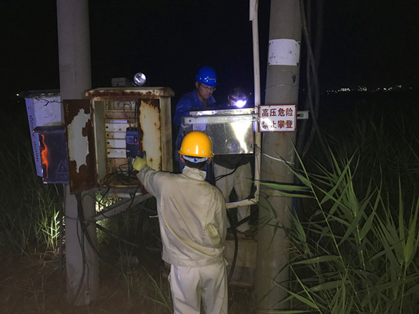 7月30日晚,臺南供電所員工在蒿西養(yǎng)殖區(qū)緊急處理由于過負荷導(dǎo)致的配電箱電表線路故障。入伏以來,連云港氣溫居高不下,電網(wǎng)負荷持續(xù)走高,7月30日晚21點,由于用電負荷突增,蒿西養(yǎng)殖區(qū)發(fā)生配電箱電表線路故障,接到報修電話后,該所值班工作人員迅速備件,冒著高溫、悶濕的條件下進行緊急搶修。圖為工作人員正在安裝配電箱電表接線。此次新招2名實習(xí)員工也參加了該項搶修任務(wù)。截止當(dāng)晚11時蒿西養(yǎng)殖區(qū)及其周邊已送電成功。