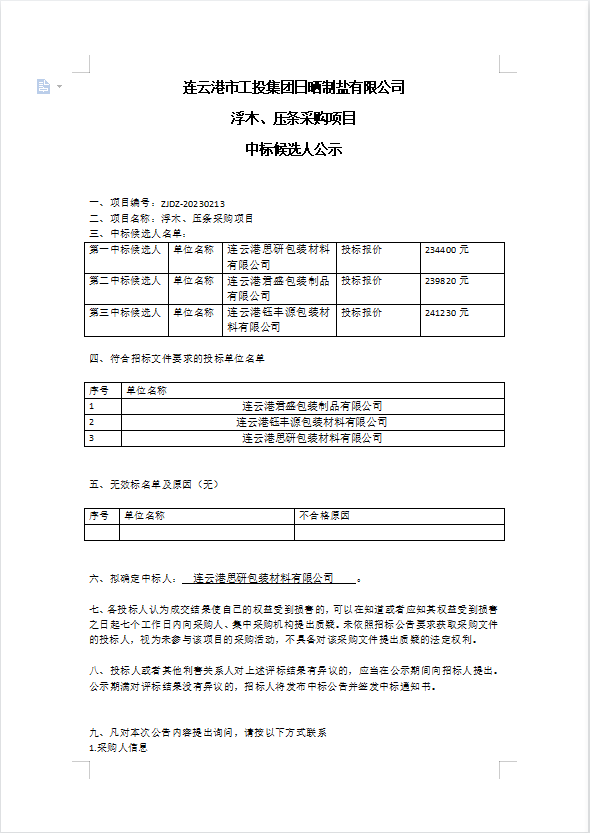 連云港市工投集團日曬制鹽有限公司浮木、壓條采購項目中標(biāo)候選人公示